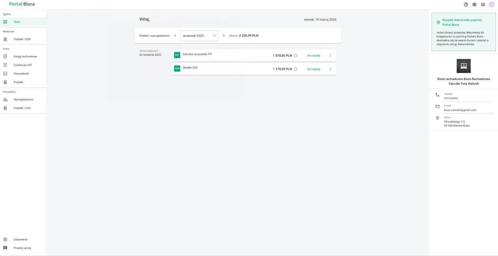 - moduł Start — integruje podstawowe informacje i zadania do wykonania w najbliższym czasie. Sprawdzisz tu również, czy zaliczki na podatek PIT i składki ZUS zostały rozliczone w terminie. Masz również możliwość zlecenia przelewu online bezpośrednio z systemu oraz wyliczenia należnych odsetek od zaległości podatkowych;