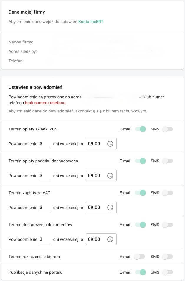 Co ważne, wszystkie dane ujęte w powyższych modułach możesz pobrać w pliku .csv lub .xlsx, co odczuwalnie ułatwia np. prognozowanie lub prowadzenie symulacji dla zróżnicowanych scenariuszy. Na koniec warto wspomnieć o bardzo użytecznym systemie powiadomień, który pozwoli Ci wywiązywać się ze swoich obowiązków podatkowo-składkowych w ustawowych terminach. Przypomnienia skonfigurujesz za pomocą czytelnego panelu (dane firmy zostały usunięte):