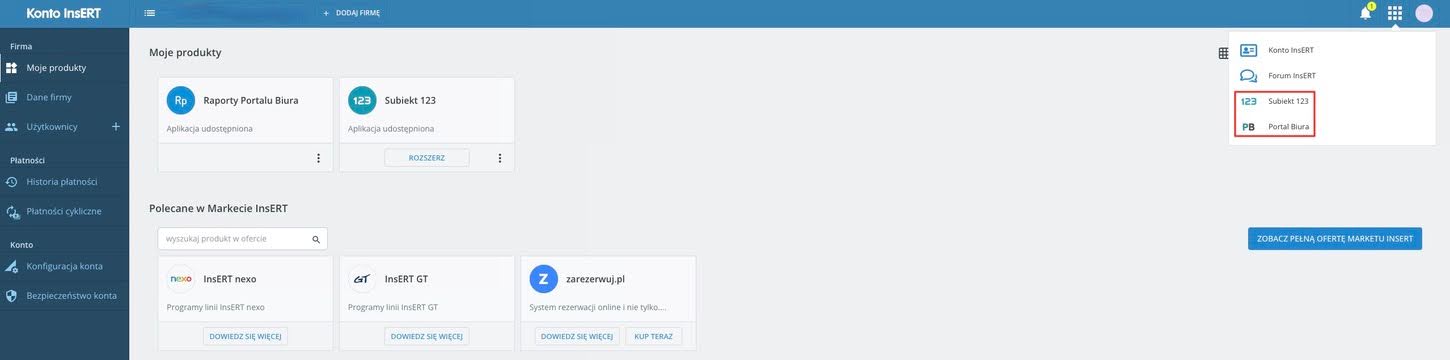 - W prawym górnym rogu przejdziesz do menu i wybierzesz aplikację Subiekt 123 lub Portal Biura.